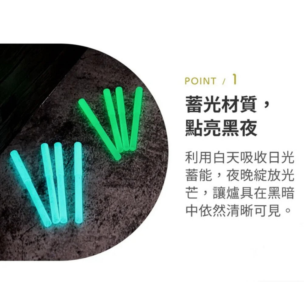 夜光部分為蓄光材質,需先照光吸收。建議使用前以手電筒或自然光照射,可提升亮度與持久度。